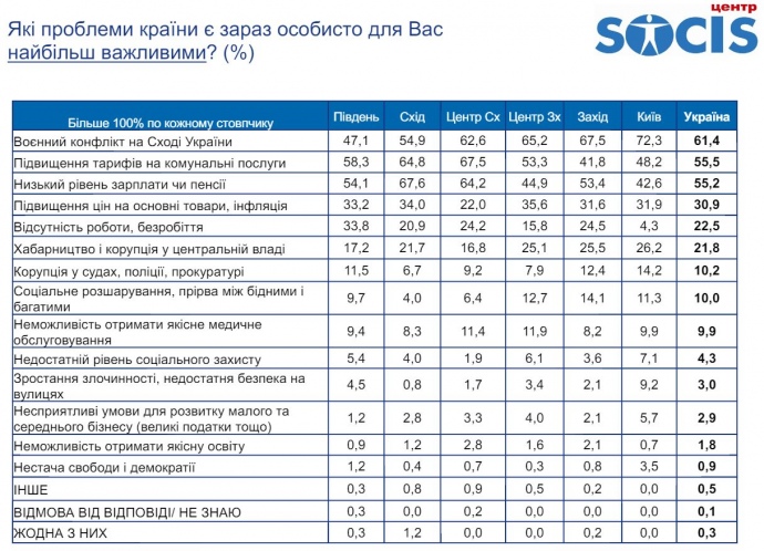 Так, війна на сході України непокоїть 61,4% опитаних, високі комунальні тарифи – 55,5%, низький рівень зарплат чи пенсій – 55,2%, а зростання цін і інфляція – 30,9%.