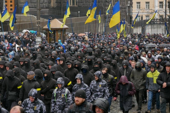 У центрі Києва учасники акції, організованої "Нацкорпусом" з вимогою покарати винних у розкраданнях в оборонному комплексі, рушили з Майдану Незалежності до адміністрації президента через Європейську площу.