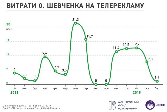 Кандидат на посаду президента і народний депутат Олександр Шевченко за 2018 рік та перші два місяці 2019-го витратив на телевізійну рекламу понад 100 мільйонів гривень.