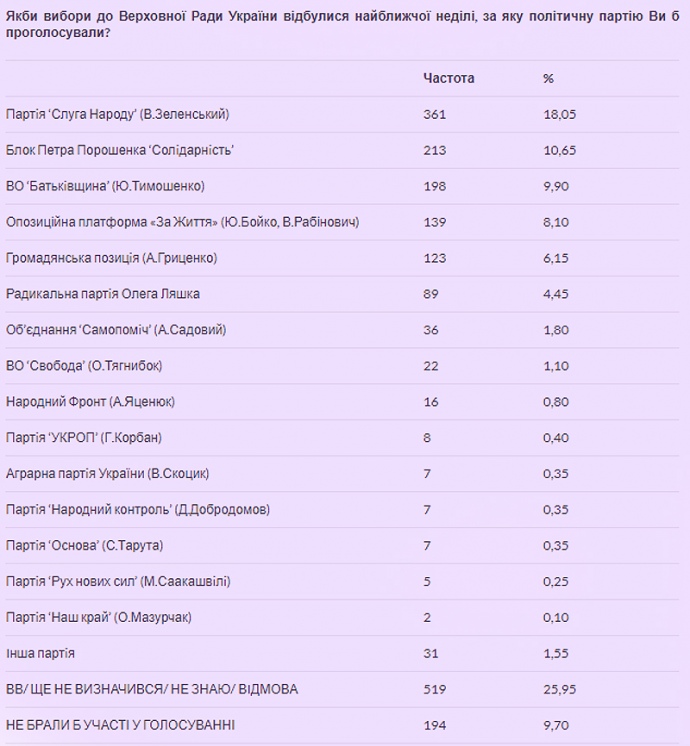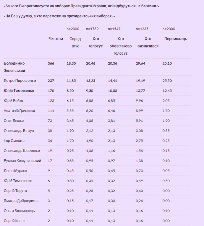 - Згідно з опитуванням, проведеним "Социсом" на початку березня, за Зеленського готові були голосувати 27,7% тих, хто визначився і має намір голосувати, за Порошенка – 19,6%, за Тимошенко – 14,8%.