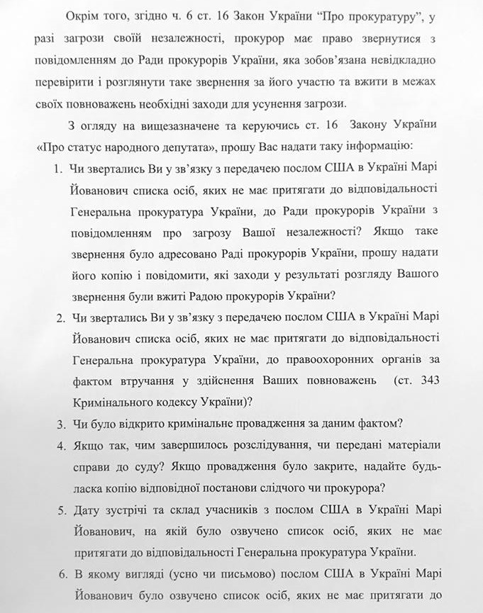 Нардеп Мустафа Найєм хоче знати, чи була якась правова реакція генпрокурора Юрія Луценка на "список недоторканних" від посла США Марі Йованович.