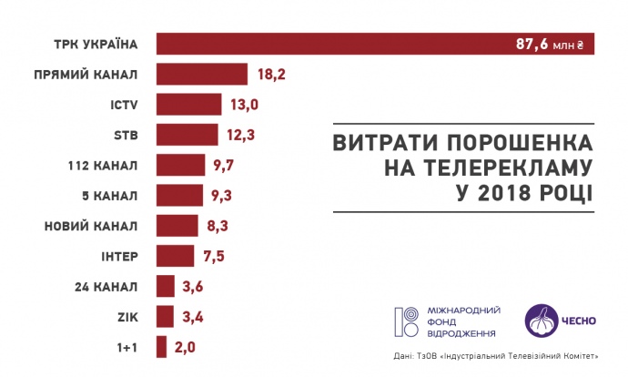За 2018 рік ТРК "Україна" мали б отримати від Порошенка близько 87 мільйонів гривень за понад 400 роликів, а 2019-го — ще майже 17 мільйонів за більш ніж 100 рекламних роликів.