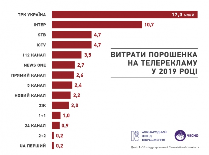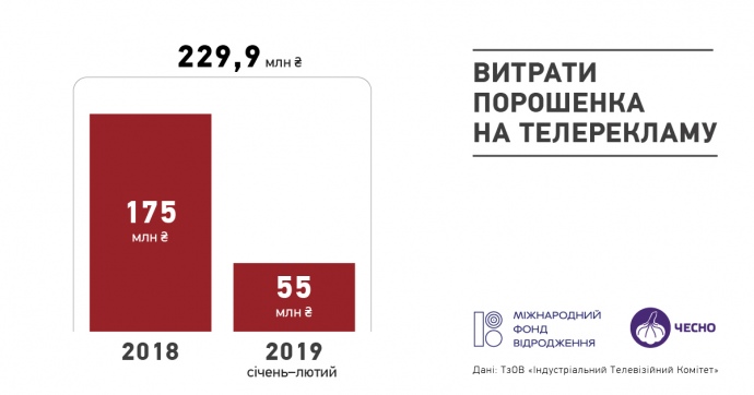 Крім того, приблизно 230 мільйонів Порошенко витратив на телерекламу 2018-го та протягом перших двох місяців 2019 року, що у 2,5 рази більше, ніж коштувала вся кампанія Порошенка 2014 року.