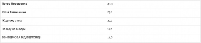 У такому випадку обидва кандидати мають приблизно рівні шанси перемогу: за чинного президента готові проголосувати 23,3%, а за лідерку "Батьківщини" – 25,1%. Ще 11,2% респондентів не підуть голосувати, а 12,6% відмовились відповідати.