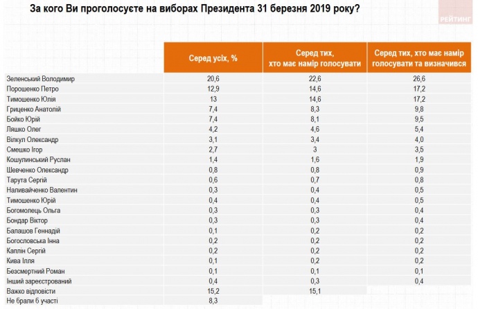 Нагадаємо, що, згідно з минулим опитуванням "Рейтингу", яке він проводив разом з КМІС і "Центром Разумкова", Зеленський набирав 27,7% голосів тих, хто визначився з вибором та мають намір взяти участь у голосуванні, бажання проголосувати за чинного президента тоді висловили 16,4%, за лідерку "Батьківщини" готові були віддати голос 16,6%.