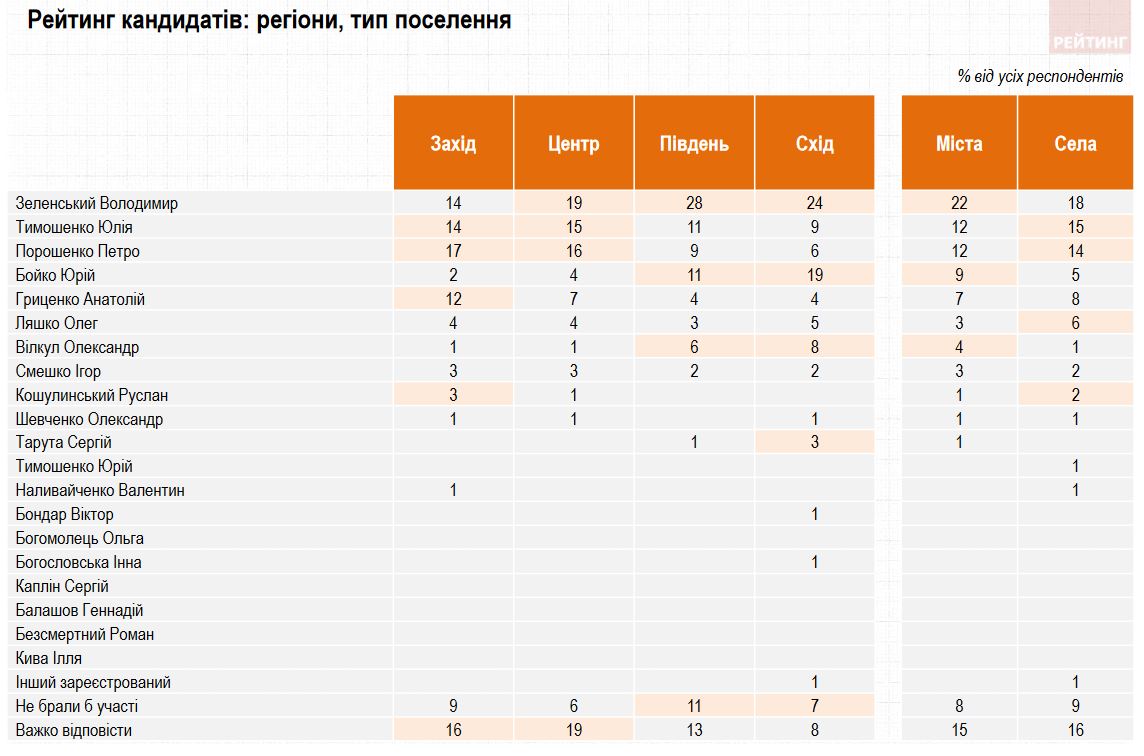 При цьому, Зеленський є лідером електоральних симпатій в містах, Тимошенко – в селах. Зеленський є лідером симпатій серед молоді і людей середнього віку, Тимошенко – серед старших виборців, Порошенко має найвищі позиції серед виборців середнього віку.