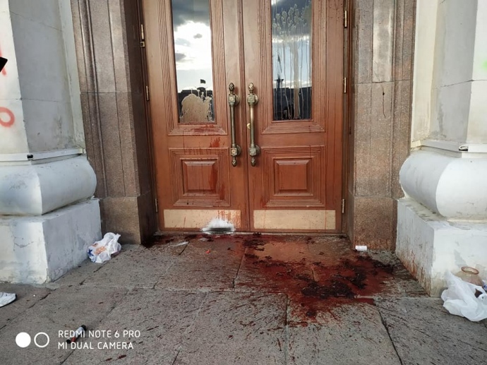 Активісти запустили салюти і розлили кров під Херсонською ОДА і облрадою з вимогою розслідувати причетність до вбивства активістки Катерини Гандзюк очільника Херсонщини Андрія Гордєєва та його заступника Євгена Рищука, який тимчасово відсторонений від посади.