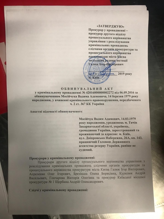 - 4 жовтня 2018 року представники прокуратури міста Києва вручили підозру керівнику Державного агентства резерву України Вадиму Мосійчуку.