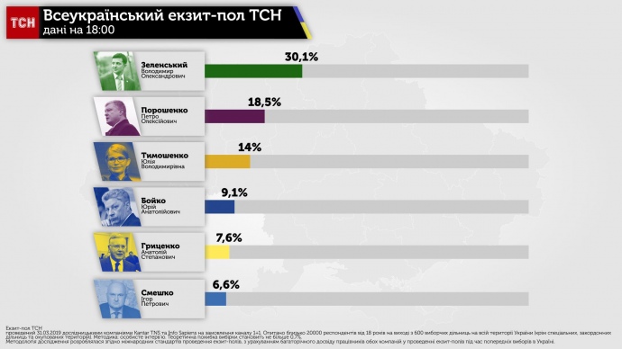 Разом з тим, згідно з результатами екзит-полу на замовлення ТСН (1+1) станом на 18:00, Володимир Зеленський набрав 30,1% голосів.