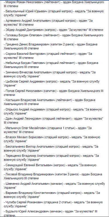 Полонені моряки нагороджені орденами Богдана Хмельницького III ступеня і "За мужність" III ступеня, а також медаллю "За військову службу Україні".
