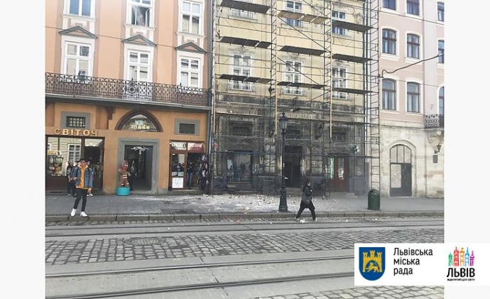 З архітектурної будівлі на площі Ринок, що у центрі Львова, на тротуар обсипалася цегла, ніхто з перехожих не постраждав.