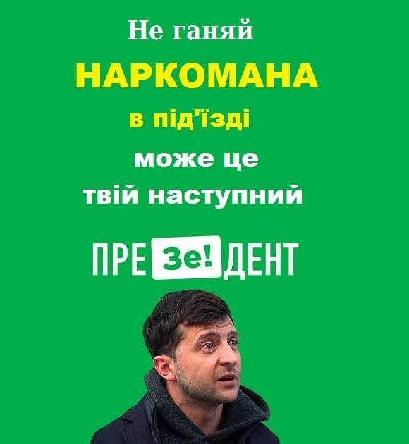 Також у соцмережі "гуляють" картинки з написом "Не ганяй наркомана у під'їзді, можливо, це твій майбутній презедент" і обличчям кандидата у президенти Володимира Зеленського.