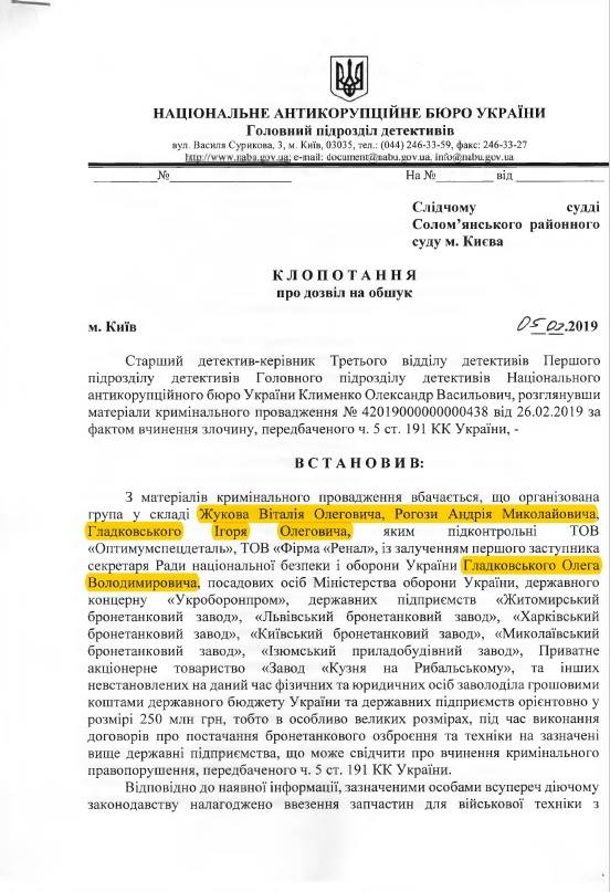 - За даними журналістів, постачання контрабандних російських деталей за завищеними цінами організував 22-річний син заступника секретаря РНБО Ігор Гладковський. Його батько нібито щонайменше один раз отримував "відкат" у 30 тисяч доларів з цієї схеми, а усі слідчі органи, включно з НАБУ, "зливали" справи по Гладковському за хабарі.