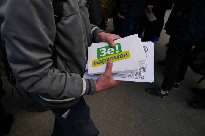 Учасникам зібрання роздають агітаційні листівки проти опонента Порошенка.