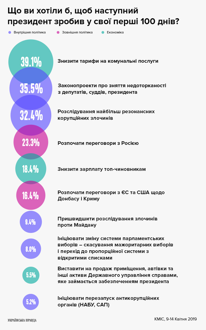 На запитання, що повинен зробити наступний президент у свої перші 100 днів роботи, три найпоширеніші відповіді респондентів були такими: