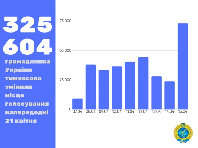 "Фактично, з 7 по 15 квітня, своїм правом тимчасово змінити місце голосування скористалися 325 604 українця", - повідомляє вона.