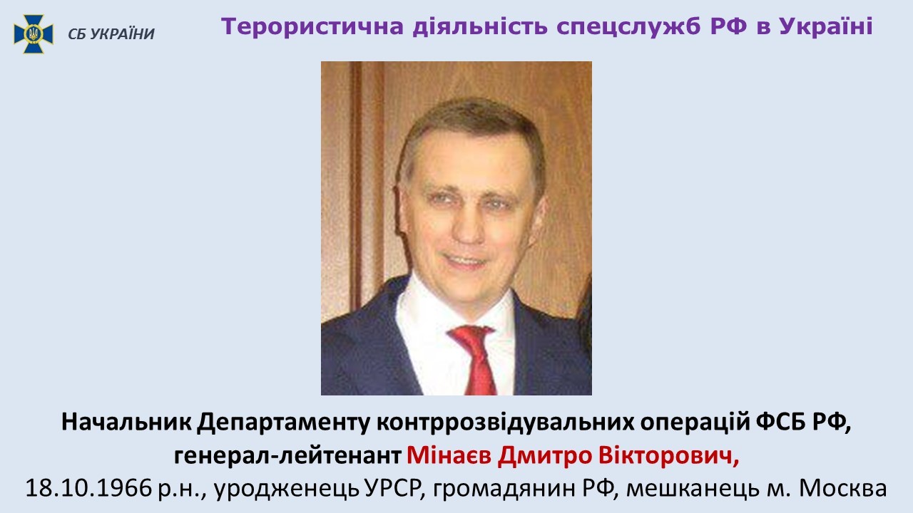 "Але справжнім організатором цих вбивств, внаслідок яких загинули і Олександр Хараберюш, і Максим Шаповал, та мав бути ліквідований ще один офіцер української розвідки, є генерал-лейтенант ФСБ РФ Мінаєв Дмитро Вікторович – начальник департаменту контррозвідувальних операцій ФСБ Росії, 1966 р.н.", – заявив він.