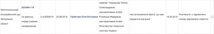 Суддя Мелітопольського міськрайонного суду Юлія Горбачова 16 квітня відмовила жінці у задоволенні позову.