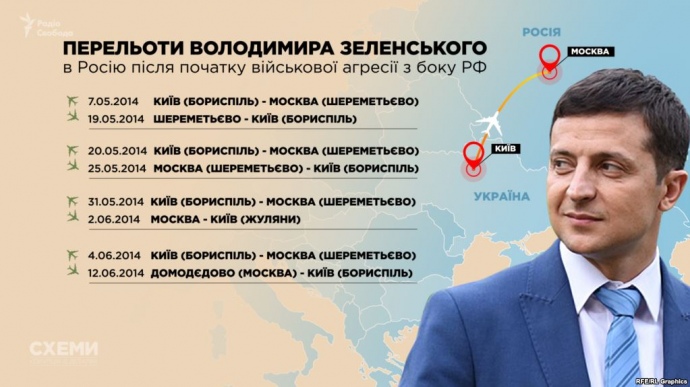 За їхньою інформацією, Володимир Зеленський вилітав із Києва у Москву 7 травня 2014 року і повертався 19 травня.
