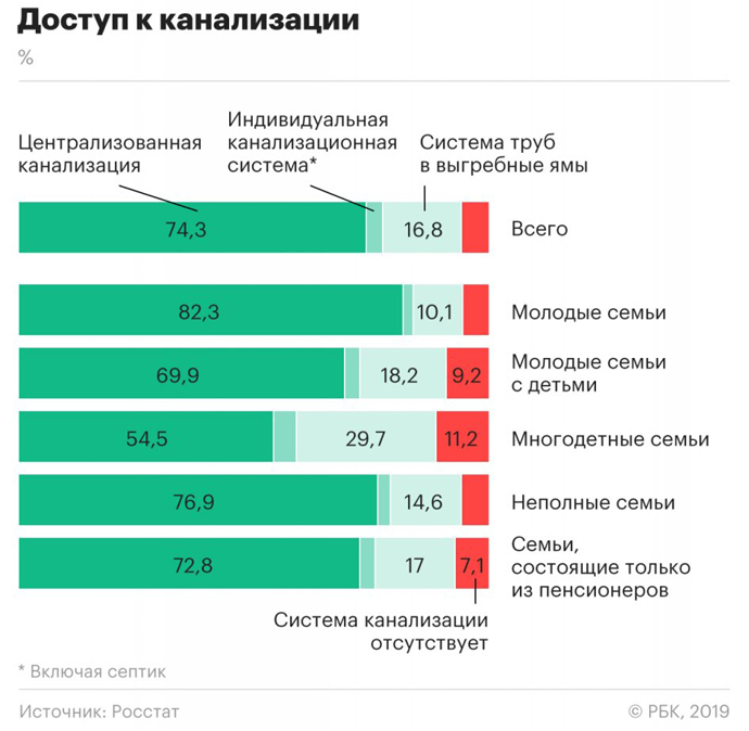 Відзначається, що 16,8% громадян РФ користуються системою труб у вигрібні ями, а у 5,8% населення система каналізації відсутня.
