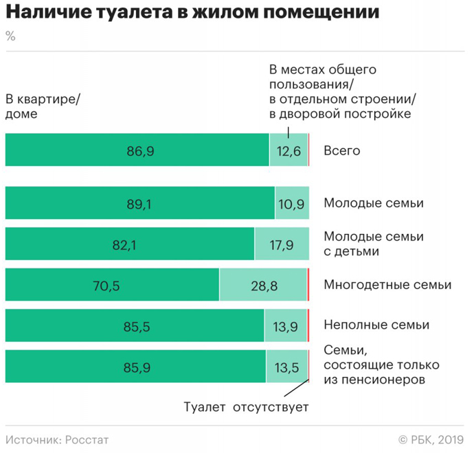 Зокрема, туалети в окремій будові або дворової будівлі мають 38,2% сільських жителів РФ і 4,7% міських.