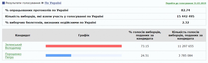 Центральна виборча комісія опрацювала 82.74% електронних протоколів другого туру виборів президента України. Володимир Зеленський набирає 73.15% голосів, Петро Порошенко - 24.51%.