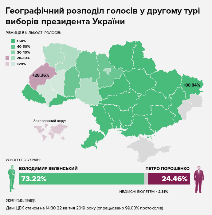 - Згідно з даними екзит-полу,за Зеленського віддали голоси 73% опитаних українців, за Петра Порошенка – 25.5%.