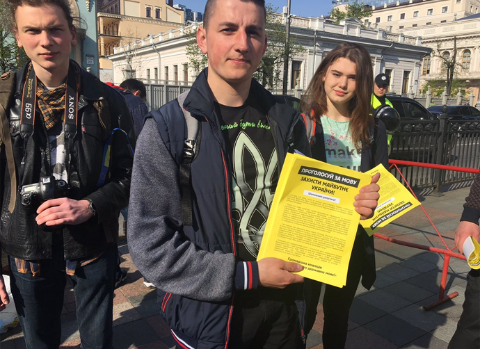 Активісти тримають саморобні плакати на підтримку закону, роздають листівки "Проголосуй за мову – захисти майбутнє України".