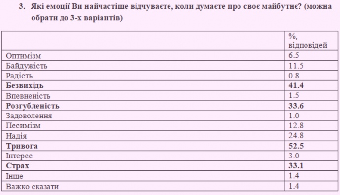 "Думки про власне майбутнє викликають у громадян, опитаних на КПВВ, почуття тривоги (53%), безвиході (41%), розгубленості (34%), страху (33%) і надії (25%)", - відзначають соціологи.