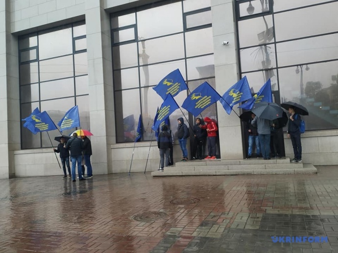 Як повідомляє Укрінформ, учасники акції тримають у руках прапори з символікою Київської міської ради профспілок та одягнуті у жовті кепки з такою ж символікою профспілок.
