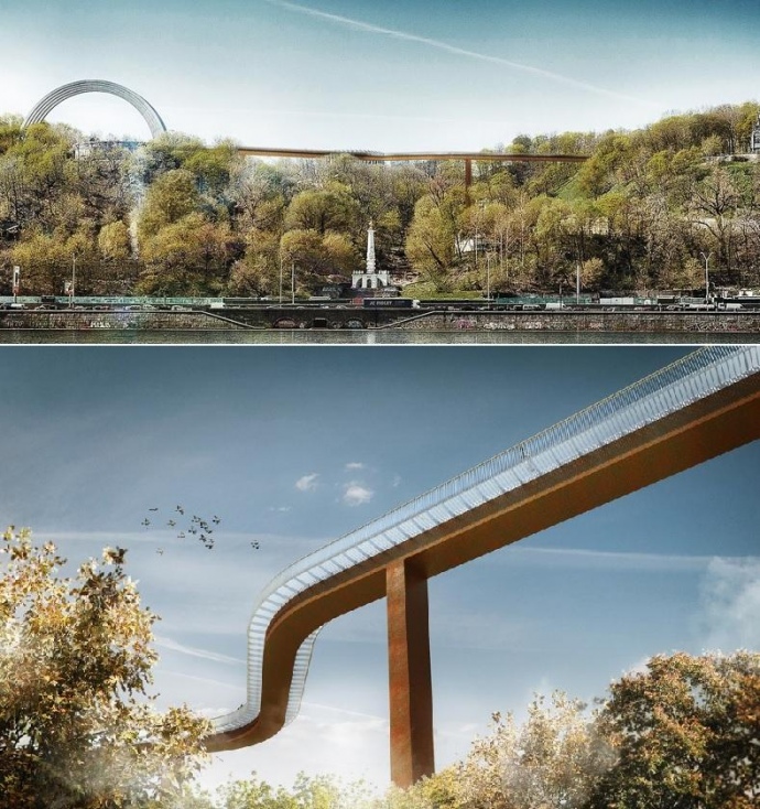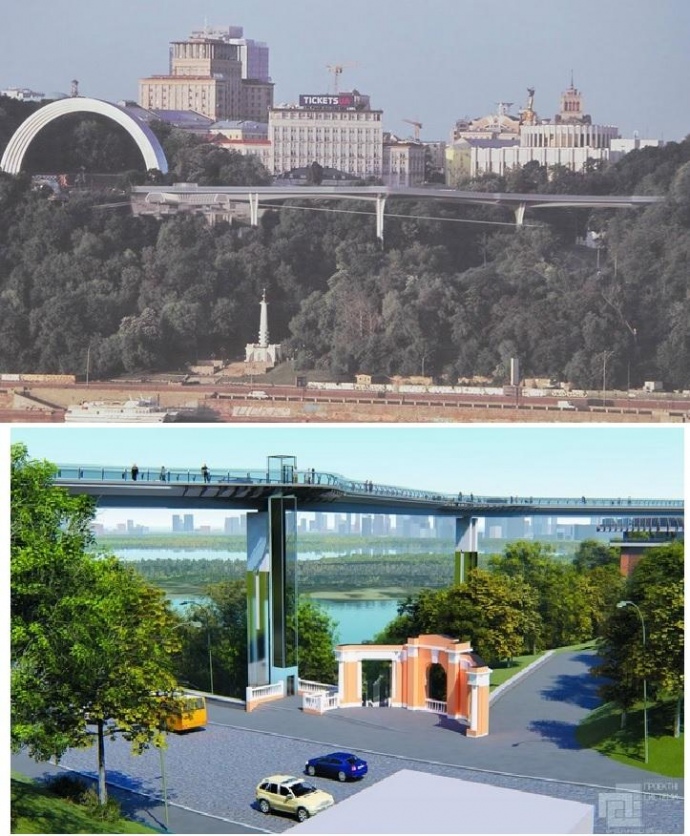 Концепцію пішохідно-велосипедного мосту між Володимирською гіркою й Аркою дружби народів у Києві взяли з проекту швейцарських архітекторів, які отримали за нього премію на конкурсі в 2013 році, але так і не отримали жодних коштів.