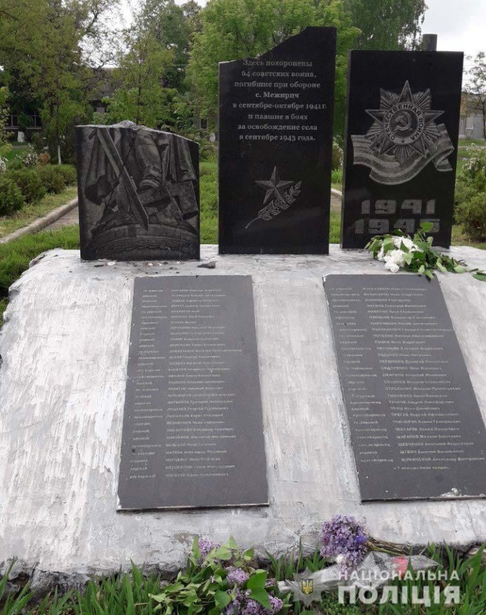 Як повідомляє поліція області, о 10:50 на спецлінію "102" надійшло повідомлення від мешканця с. Межиріч Павлоградського району про те, що в ніч на 9 травня невідомі особи пошкодили монумент пам’яті Воїнам Другої світової війни.