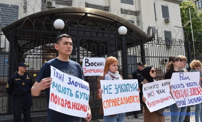У Києві під посольством Росії провели акцію з вимогою ухвалення законопроекту №9438 про внесення змін до Кримінального кодексу України для "недопущення амністії кремлівських воєнних злочинців".