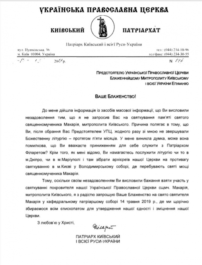 Після цього на сайті колишньої УПЦ КП опублікували різке звернення Філарета до Епіфанія та запрошення його на святкування пам’яті святого священномученика Макарія, також на бланку Київського патріархату.