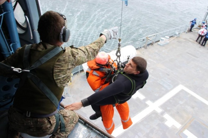 "Морський багатоцільовий вертоліт Мі-14 виконував завдання щодо висвітлення надводної обстановки в районі тренувань. Також разом із кораблями відпрацьовував дії в ході пошуково-рятувальної операції та подальшої евакуації постраждалого", - додали у Генштабі ЗСУ.