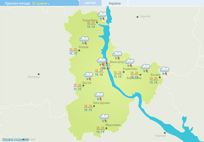16 та 17 травня у Києві дощитиме, очікується гроза, вночі +14+16, вдень до +24.