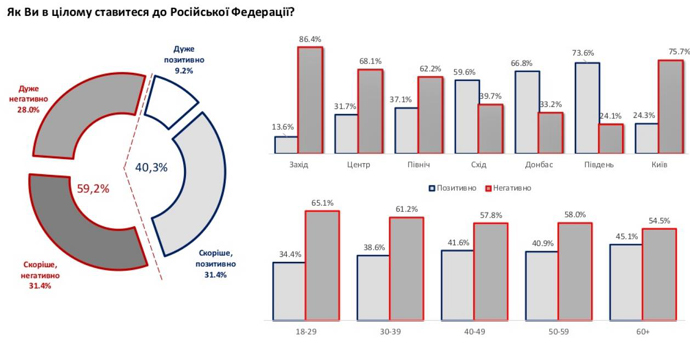 Національне опитування свідчить про те, що 40,6% українців позитивно ставляться до Росії і 12,6% позитивно ставляться до президента РФ Володимира Путіна.