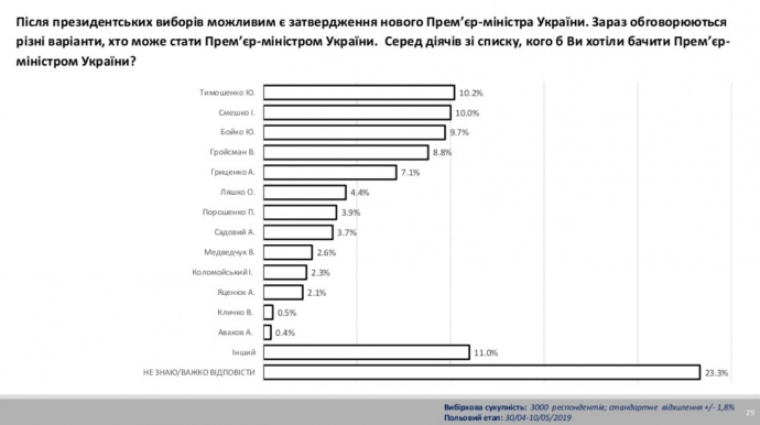 Третім йде один із лідерів "Опозиційної платформи – За життя" Юрій Бойко, за прем’єрство якого виступає 9,7% респондентів.