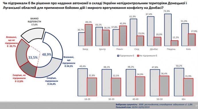 48,9% українців підтримали б рішення про надання автономії в складі України непідконтрольним територіям Донецької і Луганської областей, щоб припинити бойові дії на сході.