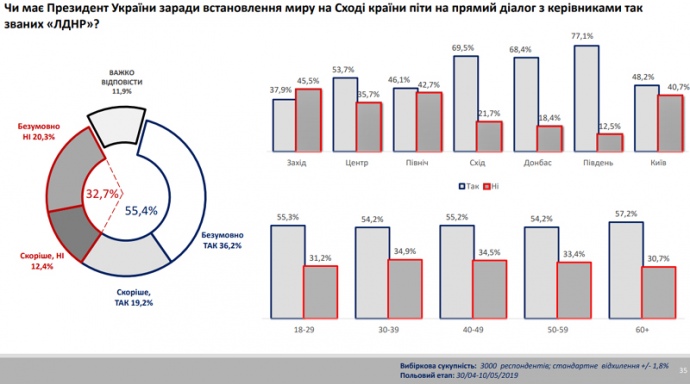 Разом з тим 55,5% українців вважають, що президент України заради встановлення миру на Сході країни має піти на прямий діалог з керівниками так званих "ЛДНР".
