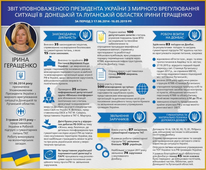 "Я подякувала президентові Порошенку за цю високу честь працювати в його команді протягом 5 років над цими важкими питаннями", - зазначила Геращенко.