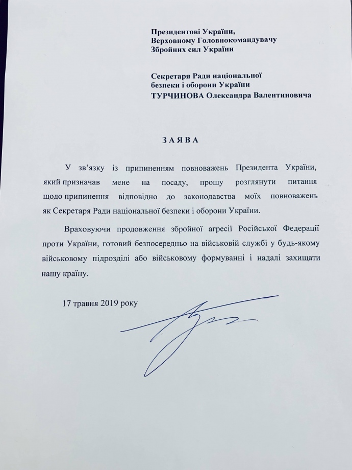 "Враховуючи продовження збройної агресії Російської Федерації проти України, готовий безпосередньо на військовій службі у будь-якому військовому підрозділі або військовому формуванні і надалі захищати нашу країну", – зазначає секретар РНБО.