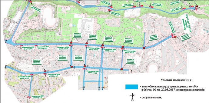 19 травня з 7:00 до завершення заходів буде частково обмежено рух транспорту на вулиці Липській від вул.Грушевського до вул.Інститутської, а також 20 травня із 6:00 до закінчення заходів буде тимчасово обмежено рух на низці вулиць.