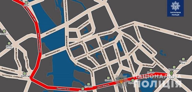Додатково передбачено тимчасові обмеження руху на проспекті Миколи Бажана, Південному мостовому переході, Наддніпрянському шосе (від Південного мосту до мосту Патона), Набережному шосе (від мосту Патона до Дніпровського узвозу) із 6:00 20 травня до закінчення заходів.