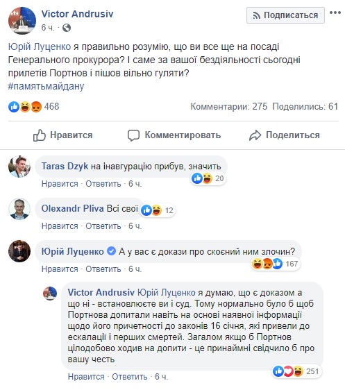 У коментарі до посту виконавчого директора Українського інституту майбутнього Віктора Андрусіва про те, що через бездіяльність Луценка Портнов повернувся до України генпрокурор написав: "А у вас є докази про скоєний ним злочин?".