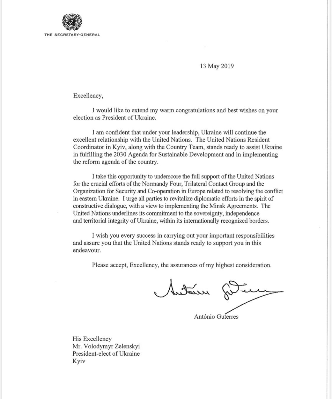 Генеральний секретар ООН Антоніу Гутерріш написав листа новообраному Президенту України Володимиру Зеленському, де висловив підтримку мирного врегулювання на сході України і запевнив у підтримці ООН України.