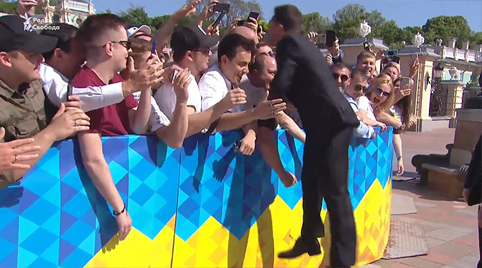 Він пройшов через площу Конституції, вітався з українцями, комусь тиснув руку, багатьом давав "п’ять", з кимось робив селфі, і навіть підстрибнув в поцілував своїх колег зі студії "Квартал 95".
