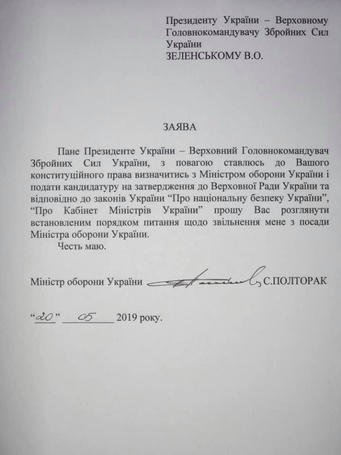 Його заява з’явилася 20 травня на офіційній сторінці міністра після того, як Полторак відрапортував на урочистій інавгураційній церемонії новому президенту Володимиру Зеленському.