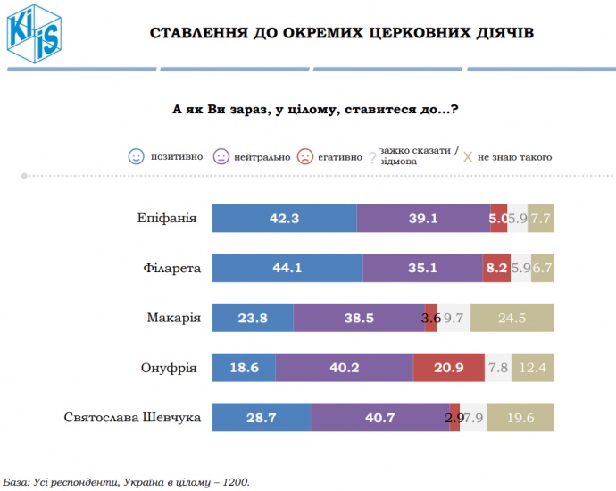 Щодо ставлення до окремих церковних діячів, то 42,3% опитаних українців позитивно відносяться до Епіфанія, 39,1% - нейтрально, 5% - негативно.