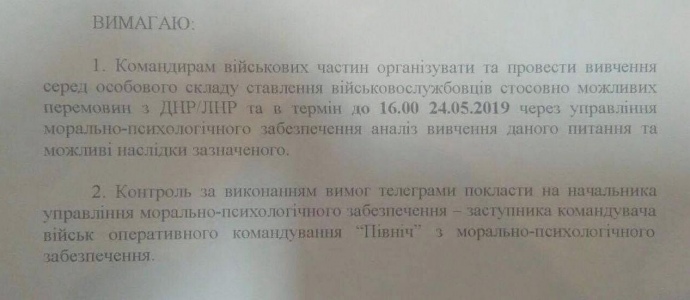 "Командирам військових частин організувати та провести вивчення серед особового складу ставлення військовослужбовців стосовно можливих перемовин з "ДНР"/"ЛНР" та в термін до 16:00 24.05.2019 через управління морально-психологічного забезпечення (доповісти – ред) аналіз вивчення даного питання та можливі наслідки зазначеного", – йдеться в папірці без вихідних даних.